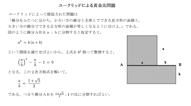 歴史上,黄金比を数学の話題として初めて意識したのは,ユークリッドとされています。彼は