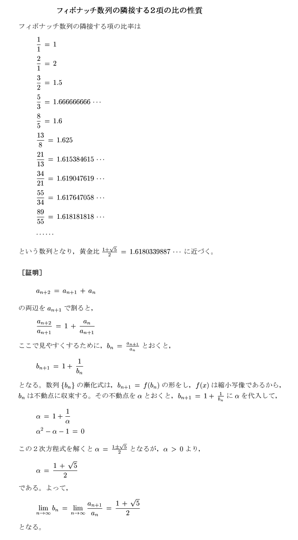 つまり,フィボナッチ数列の隣同士の数の比は,黄金比の近似的な値が並んでいる,ということです。