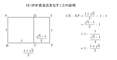 辺BCの延長線との交点をEとし,長方形ABEFを描くと,それが黄金比を持つ長方形になります。