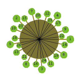 下図は,1周を3/7の比率で枝が生えていく場合をシミュレーションしています。有理数の比率の場合,何回か回ると,