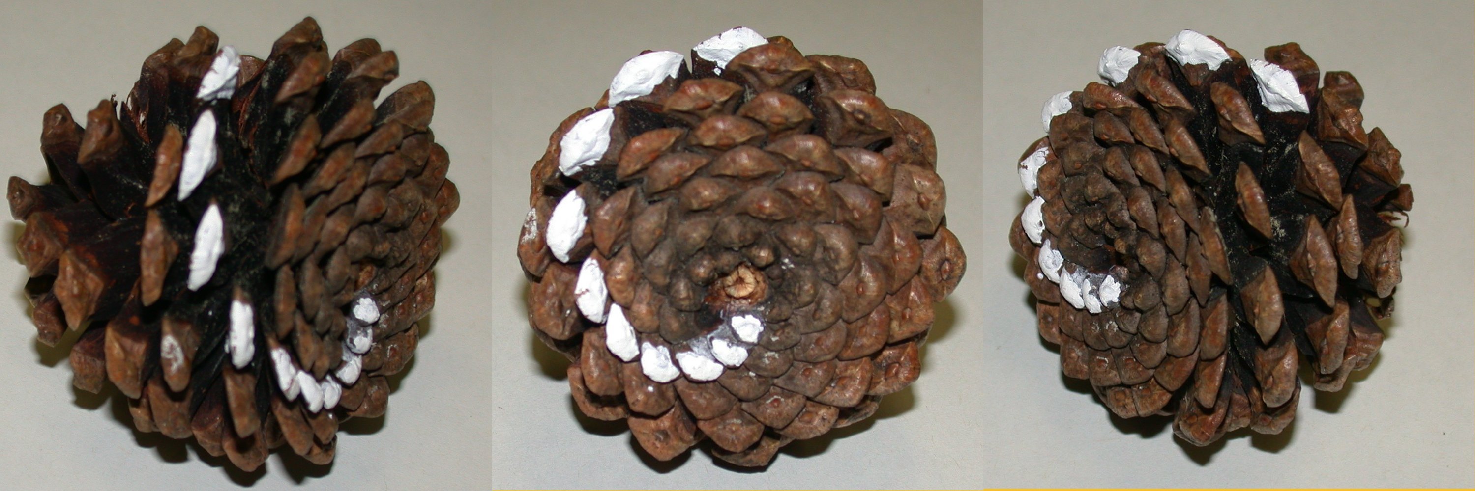 生えた芽は,少しずつずれながら,螺旋模様を作ることが分かります。このとき,逆向きにねじれた螺旋も微かに見えることに