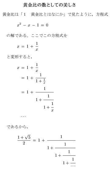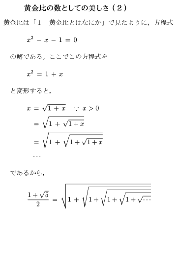 以上,黄金比と美的センスについての様々な関わり合いを見てきましたが,最後に黄金比の数字としての美しさを紹介します。